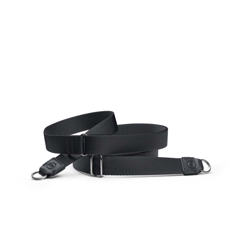 Adjustable carrying strap made from a high-quality material mix. Vegetable-tanned leather and soft woven fabric. Adjustable length from 110-135cm. The width of the strap is 2cm. The strap is supplied with protective flaps for the camera body. The strap comes in an elegant black colour.