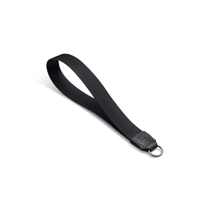 Wrist strap made of a material mix, vegetable-tanned black leather and soft woven fabric. 20cm long from the ring to the end of the loop. The width of the wrist strap is 2 cm. The wrist strap is supplied with a protective flap for the camera body. The strap comes in an elegant black colour.