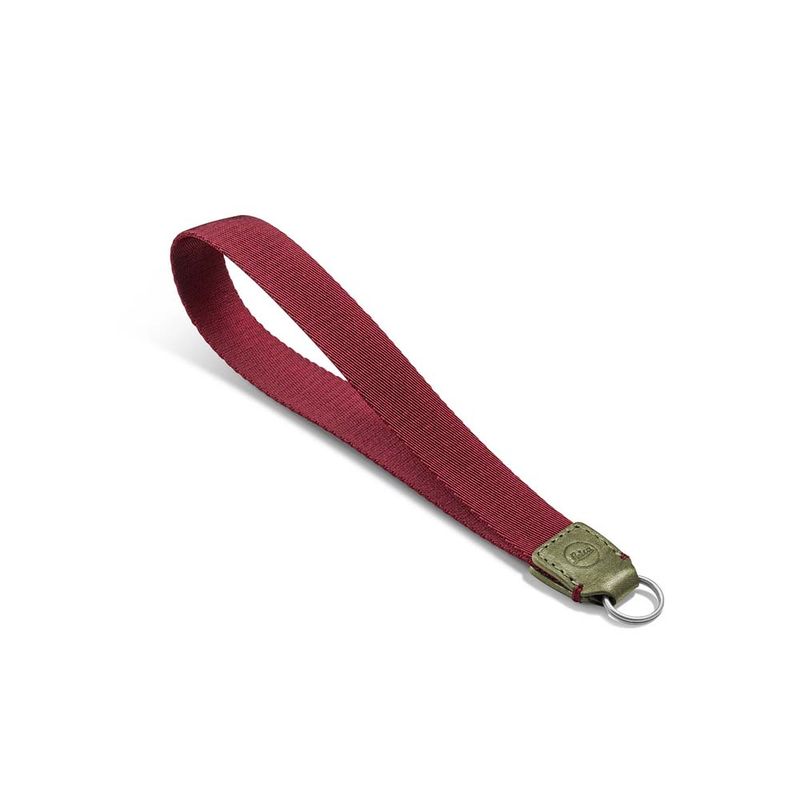 Wrist strap made of a material mix, vegetable-tanned olive-colored leather and a burgundy red soft woven fabric. 20cm long from the ring to the end of the loop. The width of the wrist strap is 2 cm. The wrist strap is supplied with a protective flap for the camera body. The decorative stitch matches the colour of the woven fabric.