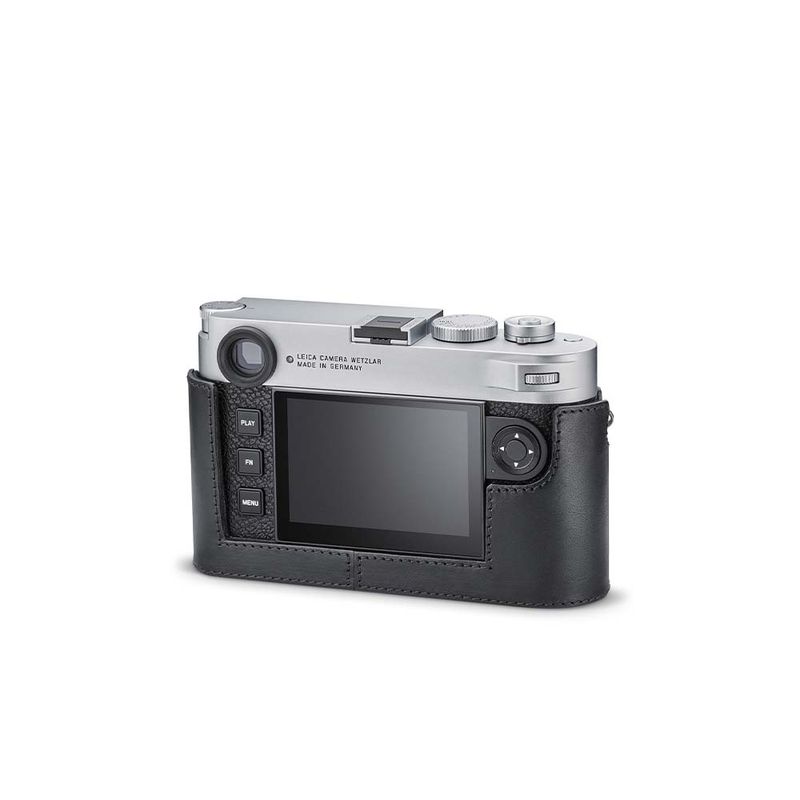 The half-case made of supple, vegetable-tanned Italian leather provides optimal protection for the M11. Available in three attractive colour options (Black, Cognac, and Olive Green). No tools are required to attach the protector, and all operating elements as well as the USB port remain fully accessible. Camera accessories such as a shoulder strap, wrist strap or thumb rest can also be used without restrictions. A flap on the protector’s bottom offers instant access to the battery and memory card, whereas an additional compartment for an additional SD-Card ensures that your M11 is always ready to shoot.