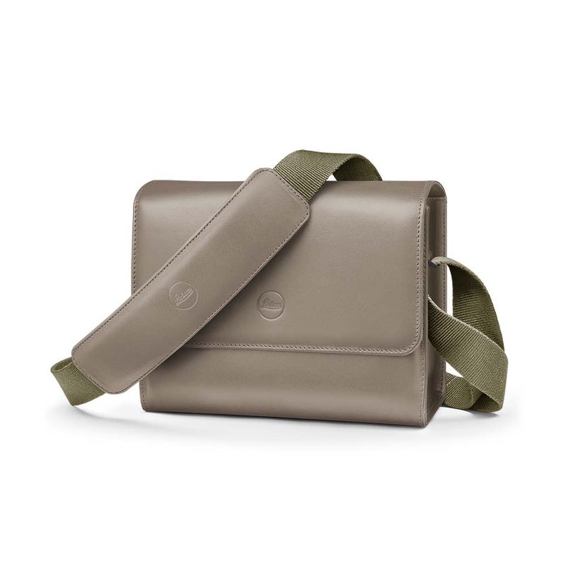 The elegant camera bag made of high-quality cowhide is ideal for stowing an M camera and up to two lenses when out and about. Concealed magnetic closures on the flap give it a stylish, discreet look, while shoulder padding on the olive green adjustable cotton strap ensures it’s comfortable to carry. The inside of the bag is made of grey micro suede and has an inner flap for additional protection of the equipment. Besides the camera and lenses, there is also room for a mini tablet at the back of the bag.