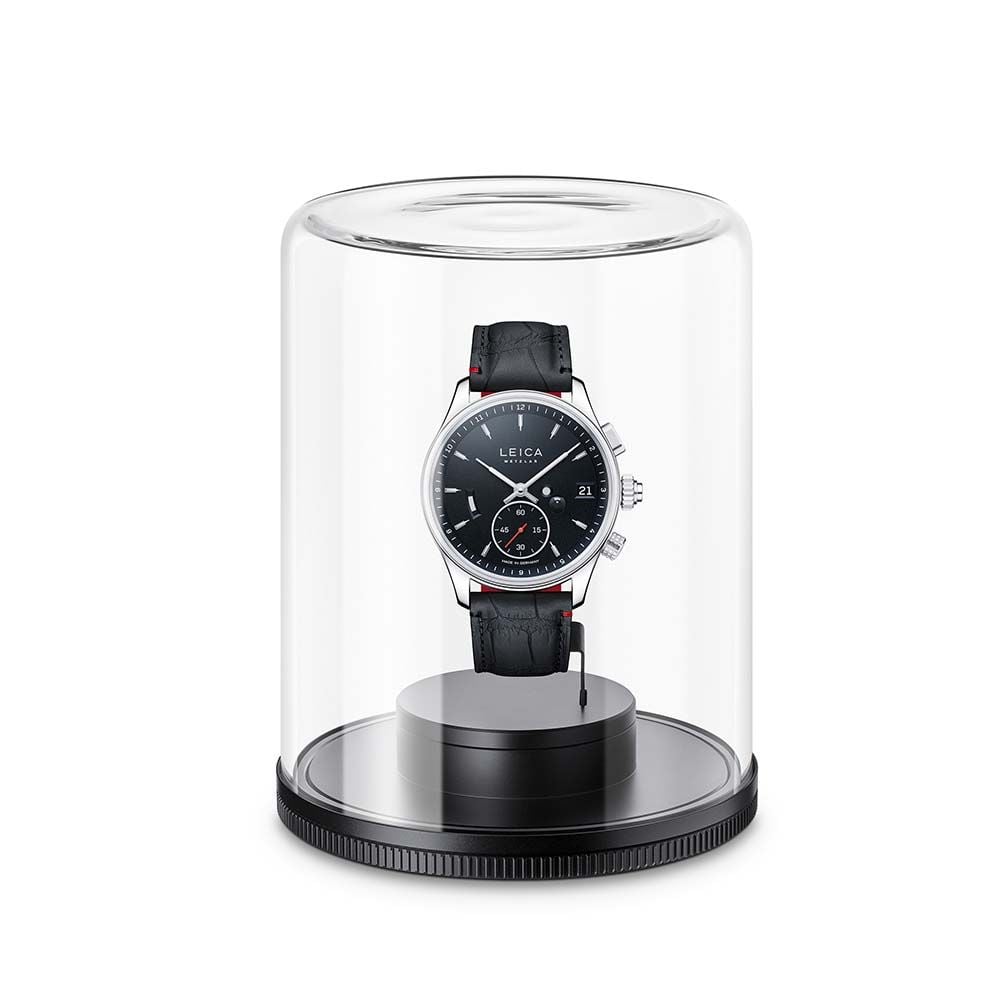 Mechanically, both models are manually-wound watches displaying hours, minutes and seconds, a date window, status and power reserve. The Leica ZM 1 and Leica ZM 2 are fitted with a scratch-proof domed sapphire crystal, a transparent case back, and are both water-resistant to a depth of 50 metres I ATM. The power reserve guarantees at least 60 hours of motion and is decked by evenly closing blades reminiscent of the shutters of a Leica camera. Similarly, the specially developed container made of glass for the Leica watch is ideal for transporting and storing Leica M lenses, too. The patented push-crown with red ceramic insert is a typically stylish, technical and aesthetic finishing touch for both watches. A classic black calf leather strap with a distinctive red interior further adds to the subtle elegance of the Leica ZM 1.